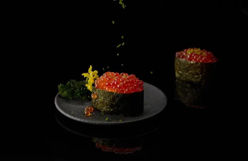 夏初,成串鮭魚卵如寶石般晶瑩剔透、熠熠生輝,飽滿的魚卵滑彈柔軟,輕觸即裂,油脂鮮甜瞬間在口中擴散開來,讓人口口滿足。