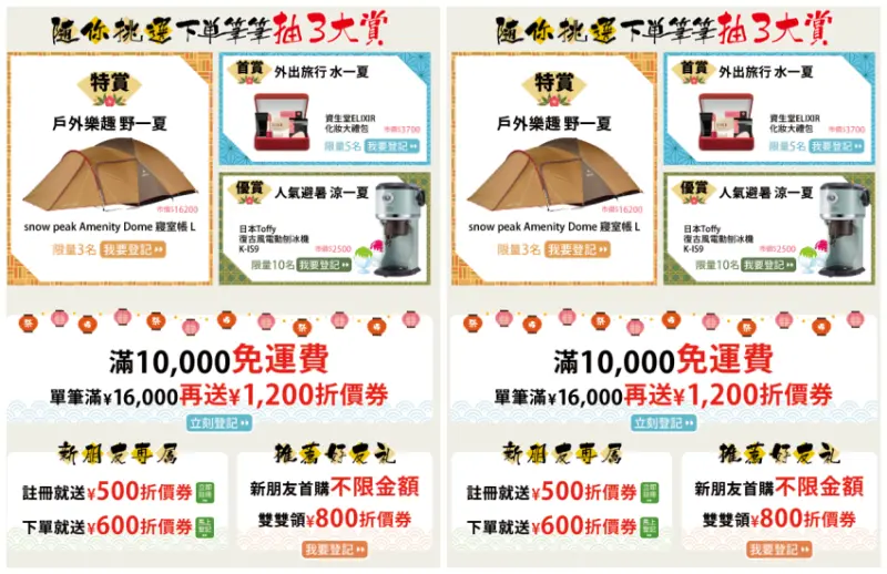除此之外,下單登記後還有機會抽中「Snow Peak寢室帳、資生堂ELIXIR化妝大禮、日本Toffy復古風電動刨冰機」等三大賞,同時在活動期間(6月起~6月30日),新會員註冊就送500日圓折價券、下單再送600日圓,若單筆滿16,000日圓再送1,200日圓折價券,超多站內消費優惠,就是要讓聰明精打細算的台灣消費者享受到最省、最優惠的藥妝購物體驗。