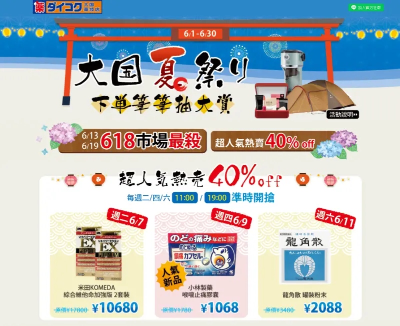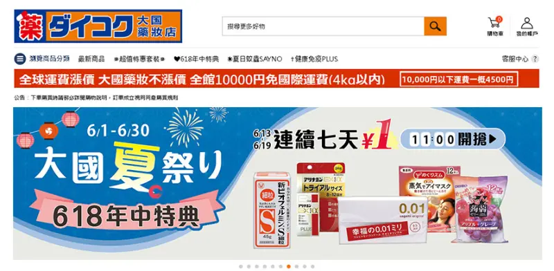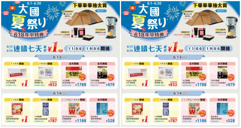 隨著日圓持續創下匯率新低點,再加上「618購物節」即將到來,大國藥妝台灣專賣店特別在6/13~6/19期間,於11:00、19:00每日兩個整點,分別推出限量熱門商品「1日圓起」(約新台幣0.223元)與5~6折的激安活動,包含台灣人最愛的「相模001、合利他命EX、花王蒸氣眼罩」等多項最熱銷的藥妝夯品,全部都有機會以市場最便宜的價格入手。