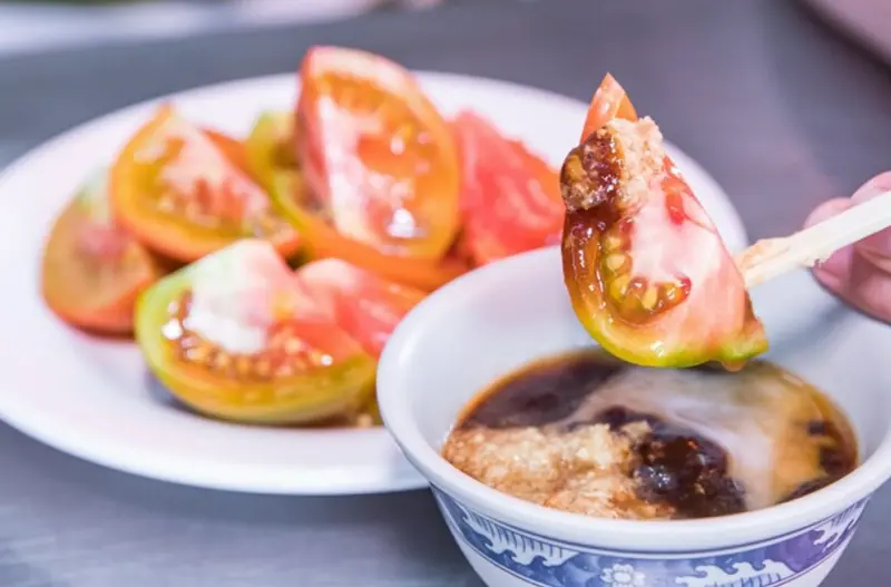 沾番茄的薑汁是用醬油、糖粉、薑泥、甘草粉特調成的醬汁,甜鹹甜鹹的夏天吃超開胃,不要說番茄了,什麼水果都想這樣沾,很多北部人看到都會覺得很新奇,但吃過一次真的就會深深愛上這一味!<全文介紹>