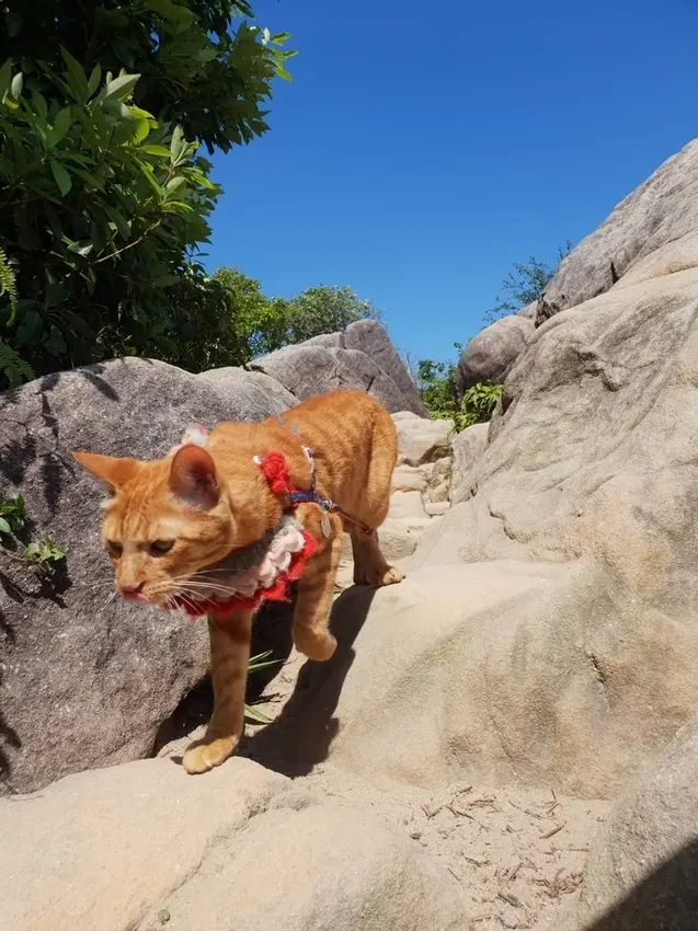 山頂有個剪刀石,是360度環景的IG熱門打卡點,並且有個大岩壁,許多網美們會站在巨石上拍照。查詢後發現山頂僅海拔258公尺,步行時間約1小時40分鐘,於是我就一人帶著兩貓出發了!<全文介紹>