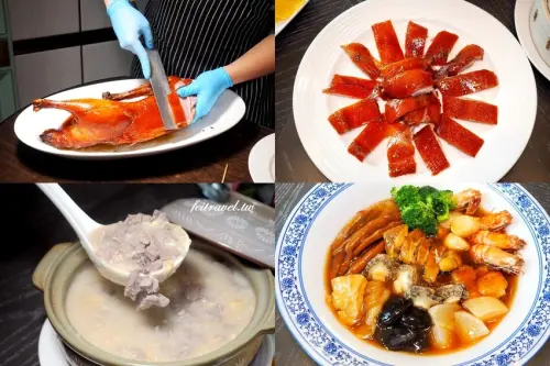 其中「嫣紅脆皮魚子醬」以歐洲進口魚子醬點綴其上,一口咬下,魚子醬的鮮甜滋味與鵝肉的柔嫩油滑完美融合,豐厚柔軟的片皮鵝在口中綻放交響,與魚子醬的鹹香達到巧妙平衡。「鵝掌海參時蔬煲」鵝掌高溫油炸後,加入八角、紅蔥頭等辛香料,滷製一個半小時,最後再加入深海海參和季節時蔬,吃得到滿滿的膠原蛋白。