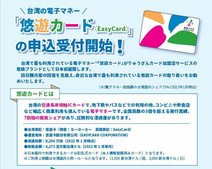 特別要注意的是,能在沖繩使用的悠遊卡必須是「本人年滿20歲以上且完成實名制」,因此只要是經過實名化的一般悠遊卡、悠遊聯名卡、悠遊Debit卡、悠遊金融卡皆可使用,至於消費上限也比照辦理台灣規則,為單次新台幣1,500元、單日新台幣3,000元為上限。