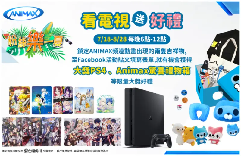Animax 粉絲樂一夏】看電視抽好禮活動暑假開跑!7/18-8/28 活動期間內鎖定Animax頻道,記下頻道畫面出現的兩隻吉祥物後至Animax官方粉絲團活動貼文填寫表單,就有機會獲得大獎PS4、Animax樂暑歡樂驚喜箱。小說《無職轉生~到了異世界就拿出真本事~》、《世界頂尖的暗殺者轉生為異世界貴族》或漫畫《工作細胞》等動漫週邊、電競滑鼠墊和Animax吉祥物OO-Kun授權商品等你來拿,詳情請至Animax官方粉絲團(https://www.facebook.com/AnimaxTW/)查詢。![]()