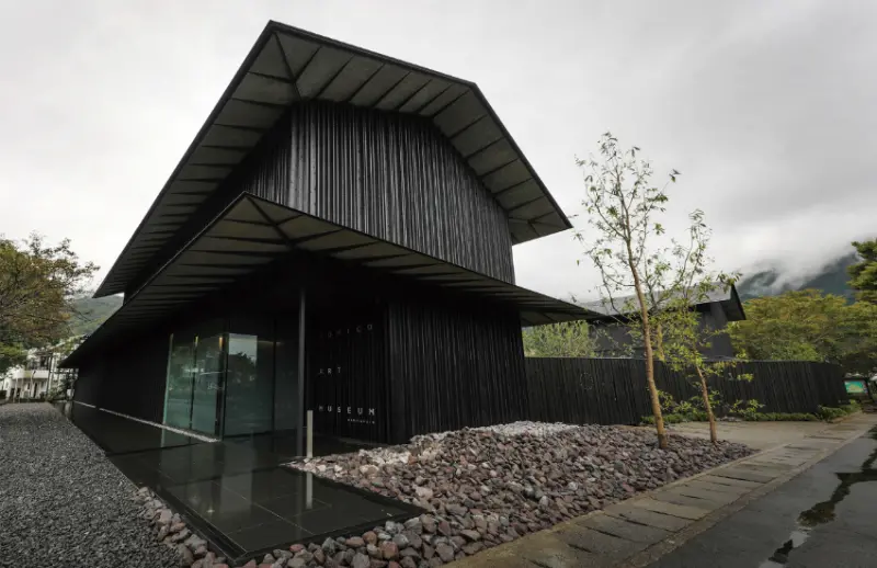 2017年於湯布院開館的現代美術館「COMICO ART MUSEUM YUFUI」,整體建築由享譽國際的建築大師隈研吾操刀設計,以黑色為基調,搭配經火焚燒過的木質感木板外牆,再融合能反照豐沛自然的水面設計,打造與周邊自然景觀共融的吸睛建築。作為美術館重要門面的品牌識別LOGO則是由無印良品藝術總監「原研哉」設計,以簡約現代的風格打造,與建築物完美融合。![]()