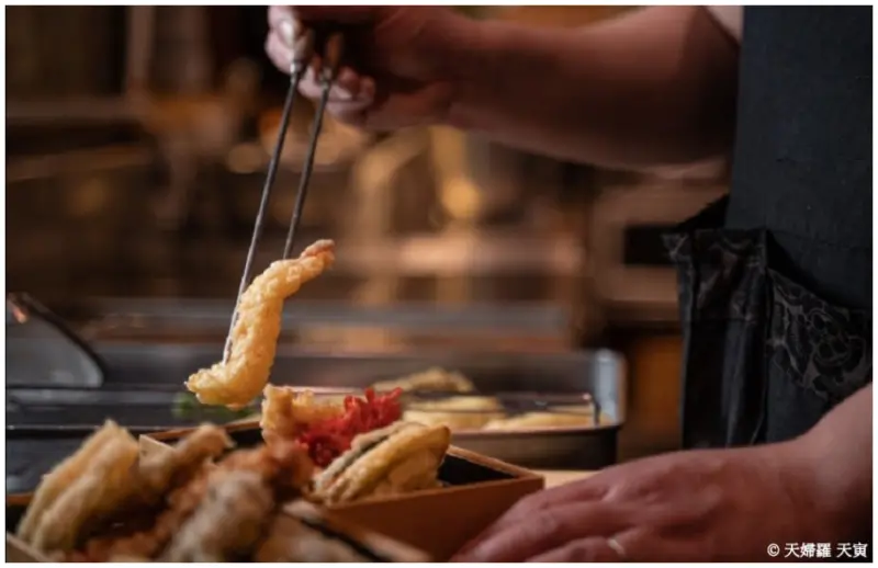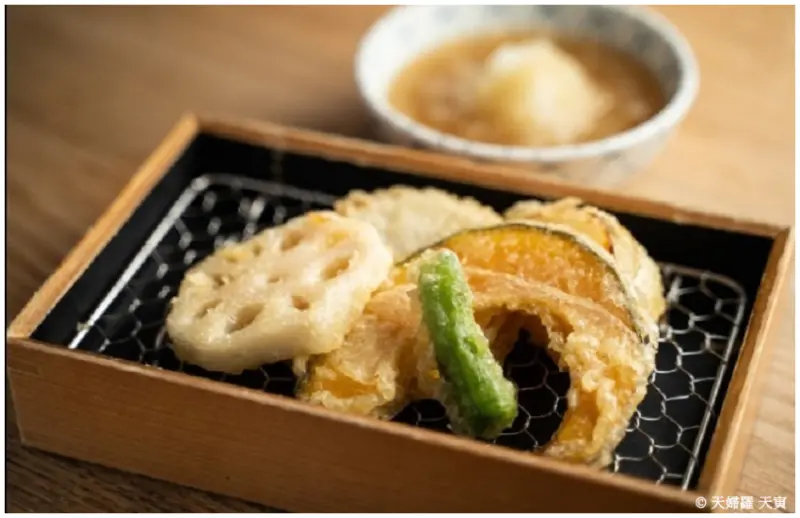 天婦羅 天寅使用當季時旬的鮮魚或蔬菜,裹以講究的麵衣之後,入油將食材酥炸至清脆爽口。提供星鰻、烏賊、沙鮻等天婦羅經典菜色,還提供口感獨特的壽司薑片、蘋果等天婦羅料理較為罕見的食材。