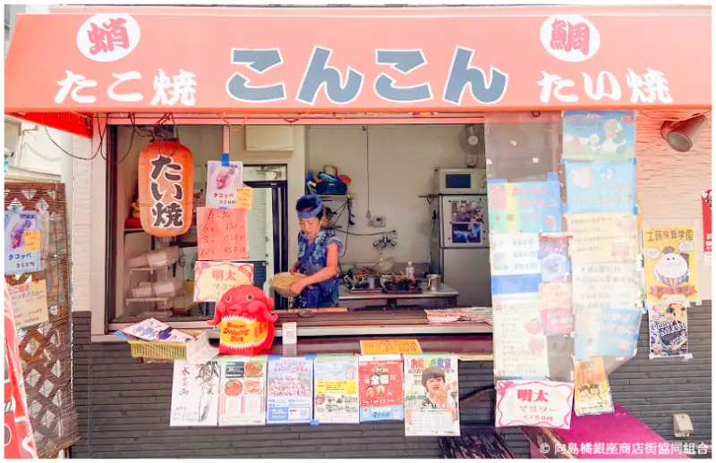 從店外貼著許多當地活動的海報來看,就足以得知章魚燒KONKON是間深受當地居民愛戴的章魚燒專賣店。使用從豐洲市場所進貨的章魚所製成的章魚燒,外皮酥脆、內餡軟嫩。醬汁選擇豐富,有披薩、咖哩、梅子等獨特口味。