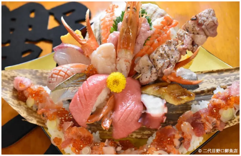 ▲二代目野口鮮魚店的海鮮丼佈滿各種海鮮,令人驚豔的是就連握壽司、烤串也在上頭