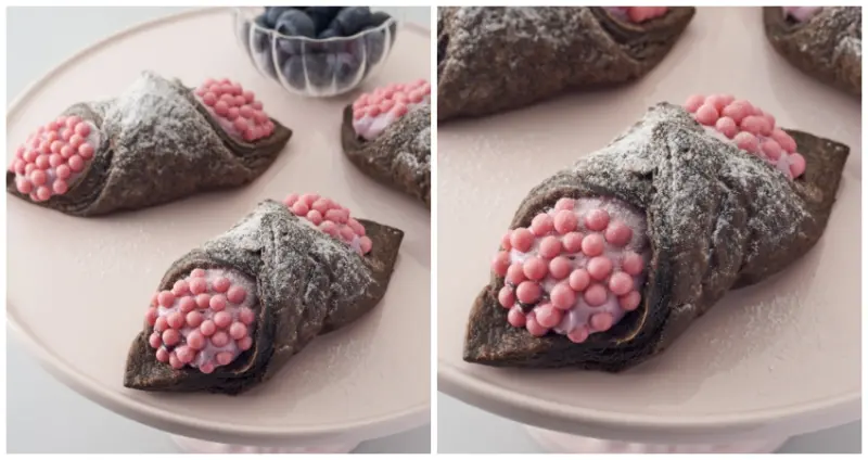 這款「藍莓可可奶油派」的外層使用了香醇濃郁的巧克力派皮,內餡則是放入藍莓醬與酸酸甜甜的藍莓奶油,最外部則放上了大量的草莓巧克力球,雖然外表讓人在第一時間有些無法接受,但仍讓不少想嚐鮮的日本民眾跑遍各大星巴克尋覓,據說吃過的人形容這款新品甜派十分酥脆、且藍莓酸甜的味道相當恰到好處,吃起來不會過度甜膩,如果不在意外表的話,其實是很好吃的一項新品,可惜台灣無法同步販售,否則也可以預期將掀起一波搶買熱潮。