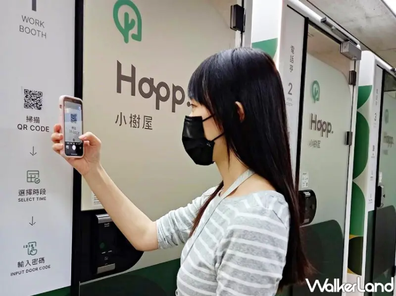Happ. 小樹屋-電話亭,採取個人包廂設計、隱私性高,設有舒適桌椅與插座,為來往的旅客提供一個不受干擾的工作環境,適合臨時商務需求、線上課程、線上會議與面試,每小時收費100元起,以時計價、線上付款、即訂即用。