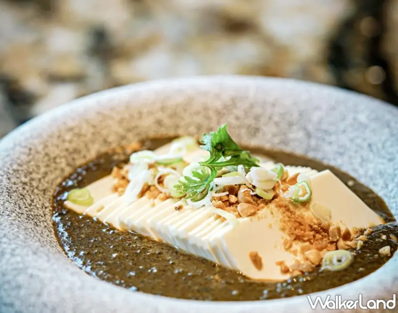 此外,還有鵪鶉蛋燒賣原是將煮熟的鵪鶉蛋包入豬肉餡中一起蒸製,而主廚此次則是將鵪鶉蛋做成流心,一口咬下蛋液緩緩流出,不但使燒賣滋味更加豐厚,也更增驚喜趣味。而麻婆冷豆腐則是以台灣街邊麵攤常見的經典配菜 – 皮蛋豆腐為概念發想,謝文主廚將皮蛋與自製的辣椒醬一起打成泥,淋在切成薄片的豆腐上,最後撒上蔥花及花生碎,香麻爽口,十分開胃。