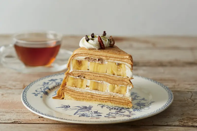除了兩款夏季新品千層之外,還有兩款千層目前也同時在日本Afternoon Tea LOVE&TABLE販售,分別是「草莓香瓜奶油千層」和「香蕉佐秘製焦糖奶油千層」。喜歡清爽口味的人不妨試試看「草莓香瓜奶油千層」,草莓和香瓜與清爽系的奶油層層交疊,最上層則淋上酸甜草莓醬,相當開胃又唰嘴;偏愛濃郁系的人則是要吃「香蕉佐秘製焦糖奶油千層」,苦甜的自製焦糖奶油配上帶有淡淡萊姆酒香味的生奶油與香蕉,特濃醇香讓人唇齒留香。