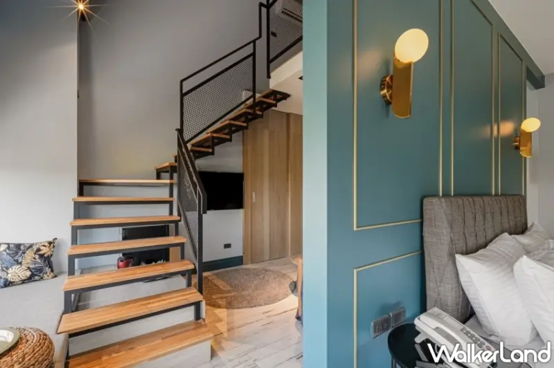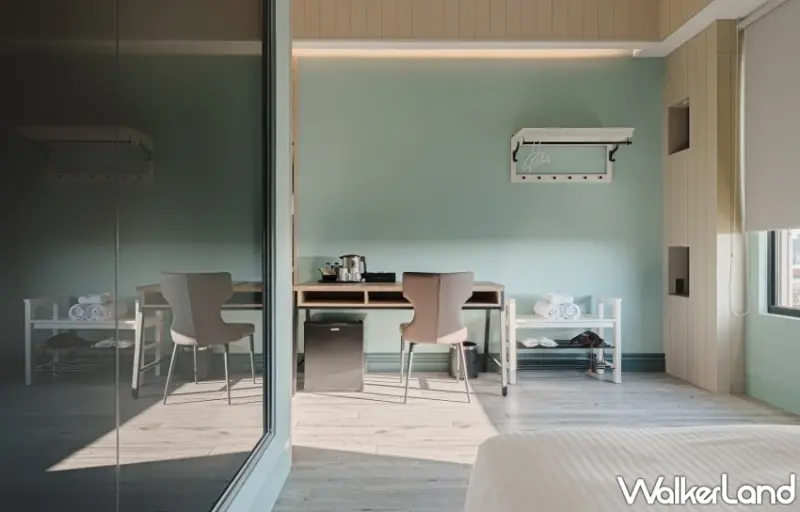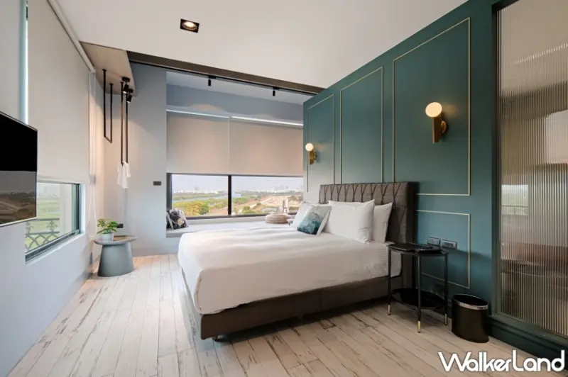 房型之中特別值得一提的是七樓專屬房型—沐時豪華河景樓中樓四人房,寬闊的17坪空間搭配挑高兩層樓的設計,方便舒適功能性十足,房內的超大面落地窗能將安平港的藍天與綠色隧道盡收眼底,窗邊長型的臥榻,則提供了另一個休憩和聊天用餐的場域。房內浴室更配置可眺望河景的浴缸,沐浴其中感受全然的放鬆,以綠意和藍天佐以綿密的泡泡消除所有旅途的疲憊。
