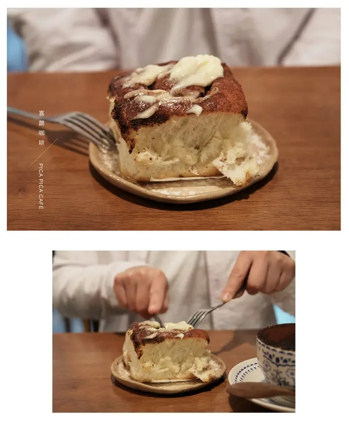這次的主角「肉桂捲」上層滿滿的糖霜,微甜不膩!喜鵲咖啡的肉桂捲是以麵包體為主,鬆軟、肉桂味也很足夠,美中不足是少了一點脆感,有點可惜~少了一點層次!但整體還是很喜歡的!<全文介紹>