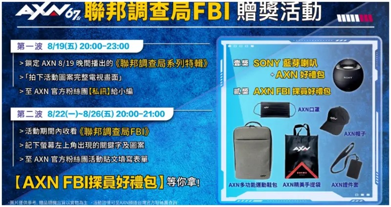 致力於滿足粉絲的AXN 67頻道又再次祭出好禮分享送給大家!第一波活動8月19日(五)晚間8點至11點鎖定AXN頻道播出的《聯邦調查局FBI系列特輯》,看到聯邦調查局FBI活動圖案,拍下完整電視螢幕畫面並私訊AXN台灣官方粉絲團。第二波活動自8月22日至26日,週一至五晚間8點鎖定AXN頻道播出的《聯邦調查局FBI》,記下電視螢幕左上角出現的活動符號及關鍵字,至AXN粉專活動貼文填寫表單回答問題,就有機會獲得藍芽喇叭、AXN FBI探員好禮包等限量好禮,絕對是劇迷的一大福音啊。活動詳情可至AXN台灣官方粉絲團查詢。