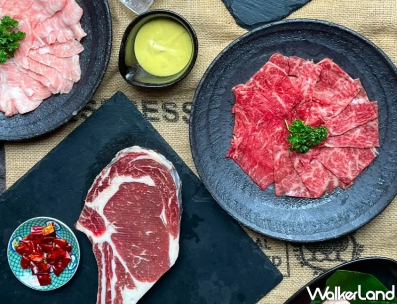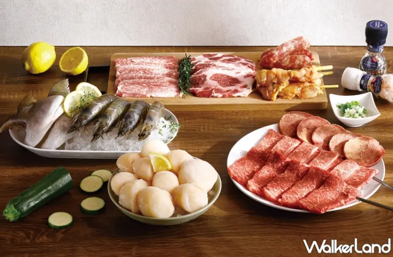 肉品:日本和牛雪花、澳洲和牛五花、厚切雪花牛、特級霜降牛、伊比利豬梅花、厚切伊比利豬梅花(限四人組合)、台灣豬梅花、台灣豬五花、無骨雞腿排