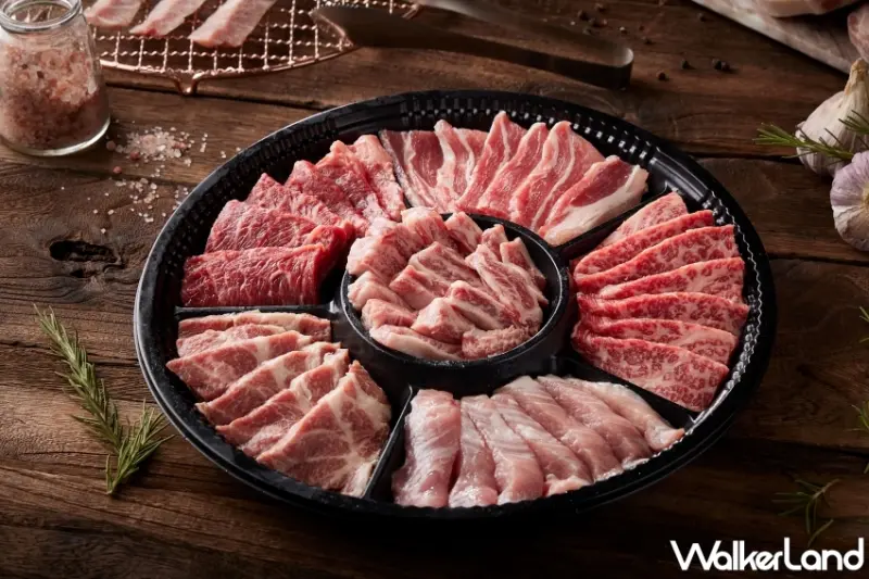 肉品:肋眼牛排、霜降翼板牛、翼板骰子牛、特選牛五花、極上牛肋條、厚切伊比利豬梅花、厚切台灣豬五花、松阪豬