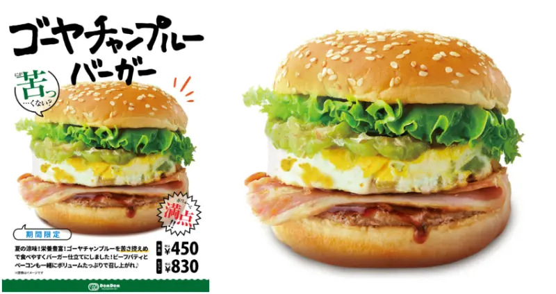Dom Dom漢堡2022年6月推的新口味則是快炒苦瓜漢堡。苦瓜據稱含有豐富的食物纖維和維生素C等營養,明明就是速食,怎麼聽起來有些健康?快炒苦瓜漢堡餡料包含培根、牛肉片等,保證吃得你足夠滿足。由於加了苦瓜,漢堡本身也比較清爽,有助於你一口接一口、促進食慾哦!價格為單點450日幣,套餐830日幣。![]()