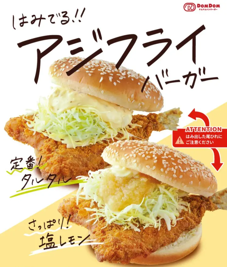 2022年5月期間限定的新品則是炸竹筴魚排漢堡!值得注意的是,這口味在改良以後復刻了。以前的醬料固定只有塔塔醬,這次則多了海鹽檸檬口味,可以選擇。餡料為超大竹筴魚排、澎湃的高麗菜絲和美奶滋。單點價為430日幣、套餐價為810日幣。![]()