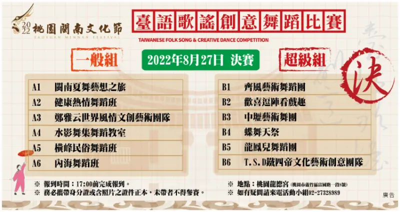 2022桃園閩南文化節,「臺語歌謠創意舞蹈比賽」將於111年8月27日(星期六)晚間6時30分於桃園龍德宮廟埕舉辦決賽,舞林高手齊聚一堂,將為桃園市民帶來精采萬分的創意舞蹈演出。