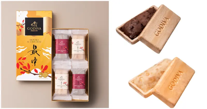 除此之外,在今年的秋季限定甜點當中,GODIVA獨家的半圓年輪蛋糕不僅新推出了栗子巧克力與焦糖蘋果兩種口味,為了紀念GODIVA在日本開設邁入第50年,也將濃郁的巧克力加入日本傳統甜點之一的「最中」裡,可以一口氣同時吃到「黑巧克力小倉」與「白巧克力豆沙」兩種口味的最中,讓習慣吃傳統和菓子的長輩們,在熟悉的口感當中嚐到不一樣的嶄新風味。
