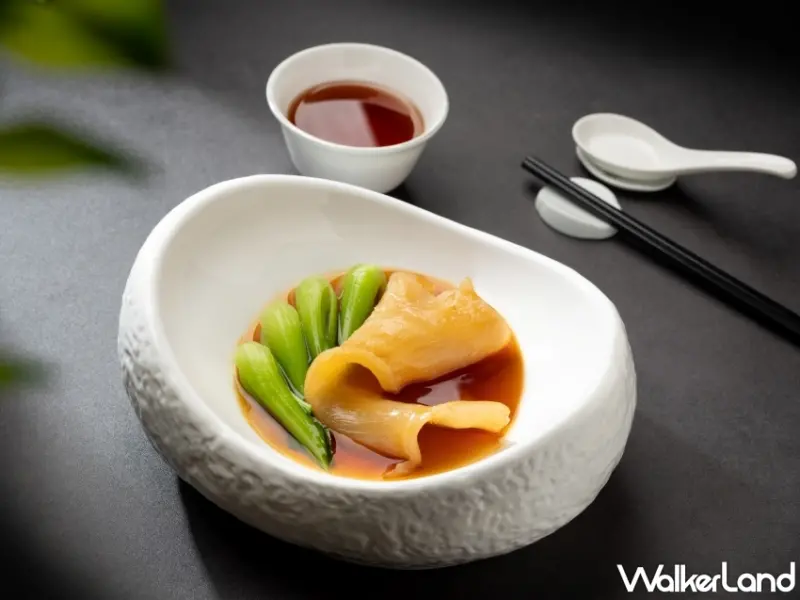 同時,還有「鮑汁扣花膠」花膠是極其珍貴的養生進補聖品,主廚先將頂級花膠泡1天冷水、再入熱水悶兩小時,泡發好後入鍋以土雞湯煨煮入味,再以私房極品鮑汁慢火燜煮半小時即成。富含滿滿膠質的花膠、可以嚐到鮑汁的甘醇,滑口濃郁的鮮美滋味讓人口齒留香。