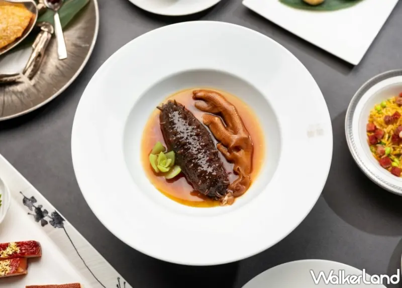 而「日本刺參伴玉掌」這道菜餚則是相當費工耗時,光泡發刺參的時間就需5天左右。主廚嚴選日本關東刺參,先泡兩天的冷水,中間換一次水並放冰箱一晚後,將內裡雜質去除、洗淨,放入熱水中燒滾後再浸泡一晚,重複兩次後待刺參發好,再加入特別調製的私房燒汁,與海參一同以大火燒乾至收汁,盛盤時再排入滷製好的鵝掌,最後淋入自製鮑汁。爽口軟糯的海參與膠質豐厚的鵝掌,形色完整、入味至極,是道老少咸宜的極品美味。