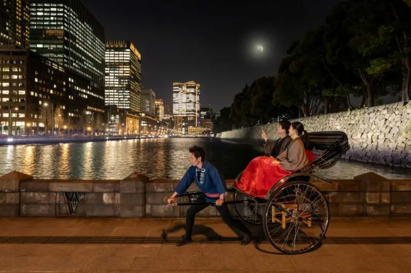 晚餐後從「虹夕諾雅 東京」出發搭上人力車,遊覽皇宮、大手町、丸之內等區域。,只有搭乘夜晚的人力車才能在高樓較少、天空開闊的皇宮外苑,透過與平時不同的角度,欣賞高掛夜空的明月和遠處閃耀的大樓夜景。此外,在丸之內的行幸大街上,還能觀賞開始染黃的銀杏林道和燈飾,美不勝收。![]()
