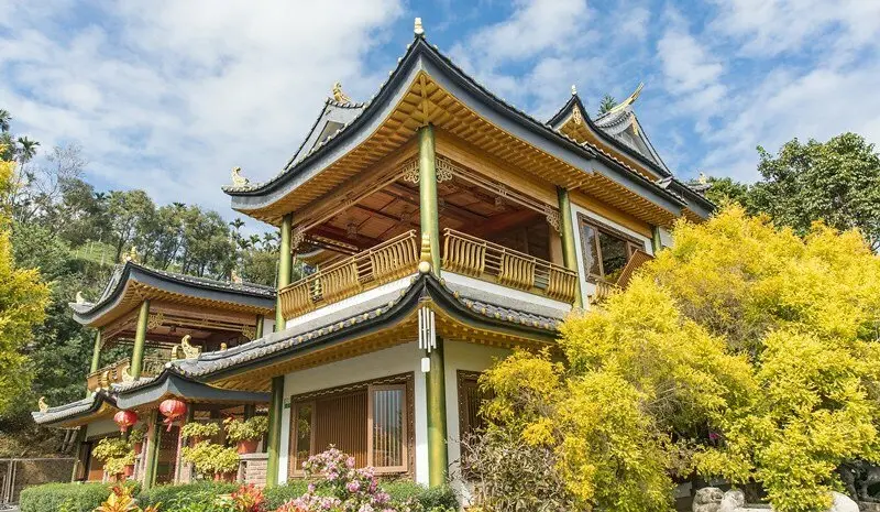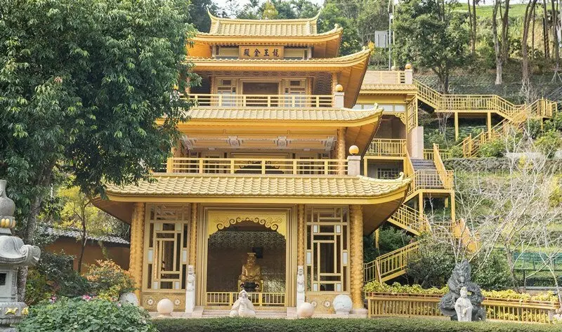 龍井、寶山這座仿唐宋的閣樓,有種山中隱世氛圍,尤其是在樓宇旁有如銀杏的黃金香柳襯托下更有一種世外桃源之美,還帶了一點點仙氣。可惜我們來的時候,廟宇因為疫情的關系沒對外開放,不過在外面拍拍照一樣也蠻漂亮的,最少在台灣要找出另一間這樣金光閃閃的廟也非易事,何況這附近的梅山風情本就值得一訪。<全文介紹>
