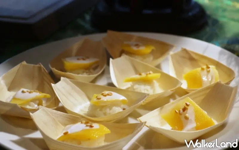 此外,甜點檯上則是推出了泰國知名街頭甜點「椰奶甜糯米飯」,配料除了斑蘭卡士達布丁,還有加了香料拌炒的椰子蝦或鹹魚,吃來鹹鹹甜甜,別有一番風味;另外還可選擇摩摩喳喳或是被馬來西亞官方譽為「國民甜品」的ABC冰(又名娘惹紅豆冰),愛珍主廚說前者通常是以椰奶調味,後者則是混合了黑糖水、三花奶水和玫瑰紅糖水,現場配料包括紅毛丹、波蘿蜜、亞達子、玉米醬、花生、紅豆和仙草…等。