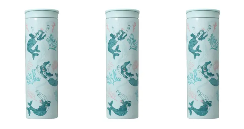 主打款「人魚藍不銹鋼保溫瓶」的淺藍色瓶身,採用了閃閃發光的珍珠亮粉,營造出光線反射在海面上、波光粼粼的視覺效果,圖案則是印上被許多珊瑚圍繞的人魚,優雅地在大海中游泳,喜愛療癒海洋系周邊的粉絲可別錯過收藏的機會。
