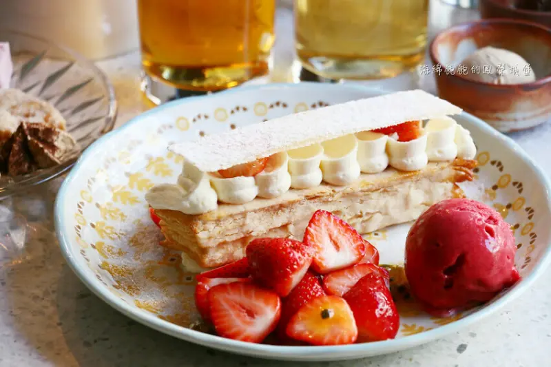 草莓千層派超美的拉,草莓控會瘋狂~耗費2天半手工壓製的千層派皮,烘烤後入口脆而酥鬆,酥脆派皮上面有柔滑的卡士達奶油及輕薄的杏仁糖片,三者合一口感相當有層次感,讓人驚艷!被姊姊譽為台北第一名法式甜點、草莓千層派!<全文介紹>