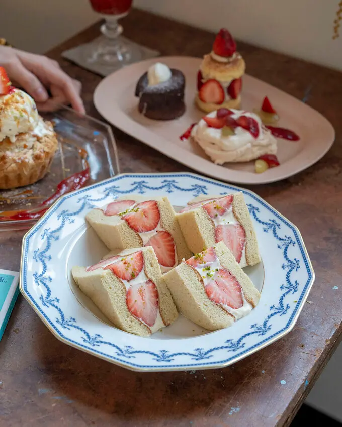 「草莓三明治」綿密的戚風蛋糕體使用島砂糖,細膩的草莓三明治口感,拍完照同時瞬間分食光。招牌蘋果派放上一球冰淇淋,酥脆的外皮要趁熱吃,周圍淋上海鹽焦糖醬,一口挖起好滿足。<全文介紹>