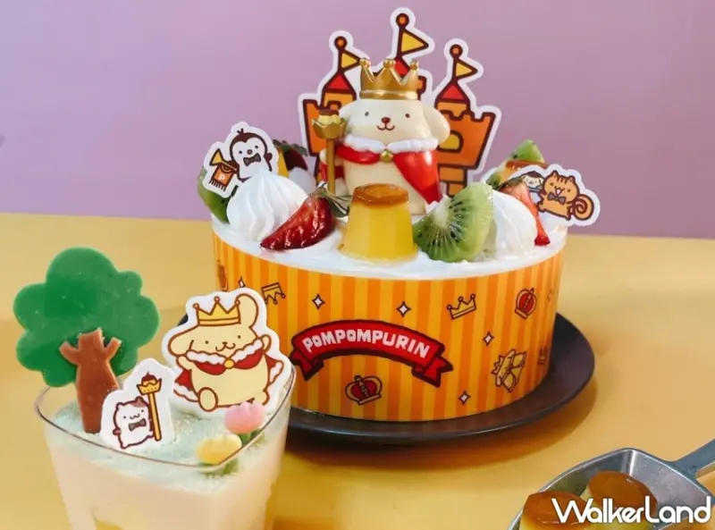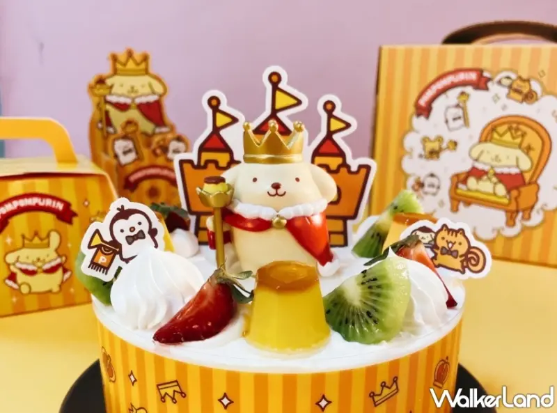 布丁狗-甜點王國6吋,可愛十足的布丁狗披上紅色披風頭戴皇冠,手拿布丁造型權杖,化身為甜點國王,和好朋友一起在城堡裡歡樂慶祝,蛋糕裝飾除了有新鮮水果外,還有Q彈的布丁造型果凍,蛋糕體以桔香戚風蛋糕為底,搭配卡士達餡與焦糖杏仁碎,夾心有可口的黑糖麻吉與布丁,滿滿的焦糖布丁風味與多重口感,上面的布丁狗公仔高6.5公分,是可以收藏的夢幻逸品。