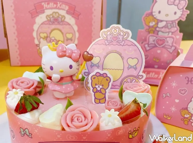 其中,HELLO KITTY夢幻玫瑰舞會7吋,最萌小公主HELLO KITTY換上粉色禮服,和可愛小熊準備搭上馬車前往夢幻玫瑰舞會,周圍不僅有滿滿精緻的玫瑰與小花造型巧克力,還有鬆軟棉花糖與新鮮草莓,搭配草莓慕斯與草莓果醬,加上Q彈可口的莓果Q凍,香甜可口又微酸的口感,絕對能滿足草莓控的味蕾。蛋糕吃完還能保留6.5公分高的HELLO KITTY公仔收藏。