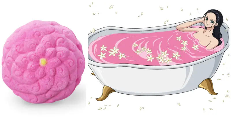 另外2款惡魔果實沐浴球分別是羅賓吃下的「花花果實」與喬巴食用的「人人果實」,花花果實沐浴球的外表是少女們都很愛的粉紅球狀,香味組合也是浪漫的「天竺葵油、大馬士革玫瑰萃取物、茉莉花萃取物」,「人人果實」的外型則是還原可愛的蘑菇狀,香味是「佛手柑、可可萃取物」等所組成,特別的鮭魚粉沐浴劑色澤也深受女性喜愛。