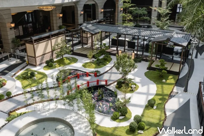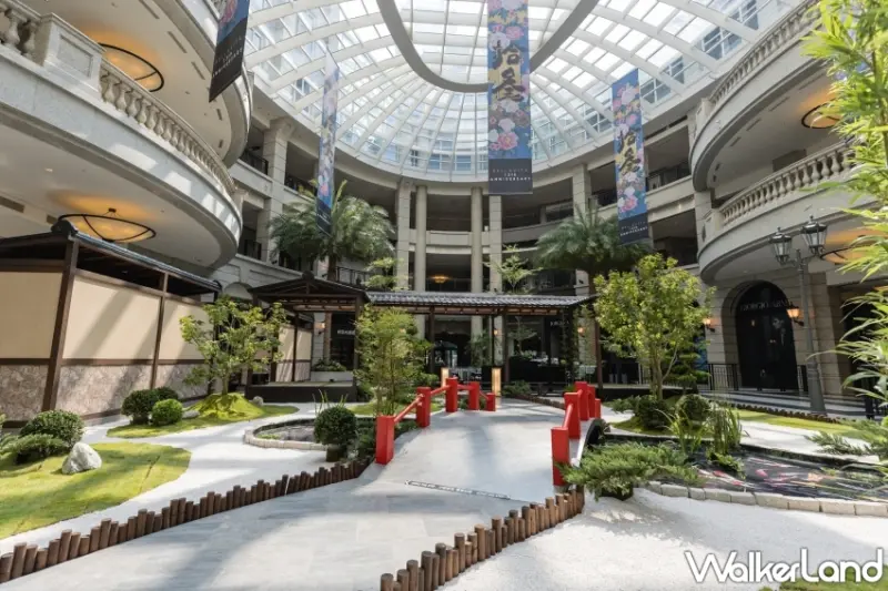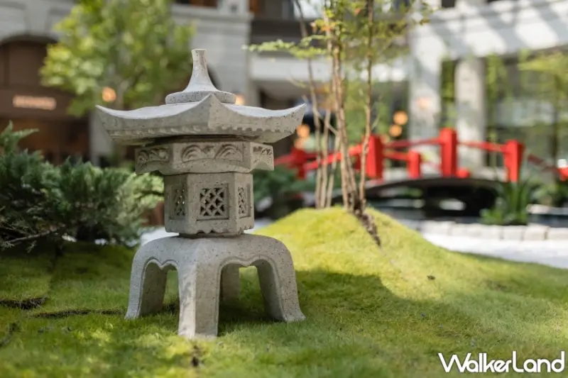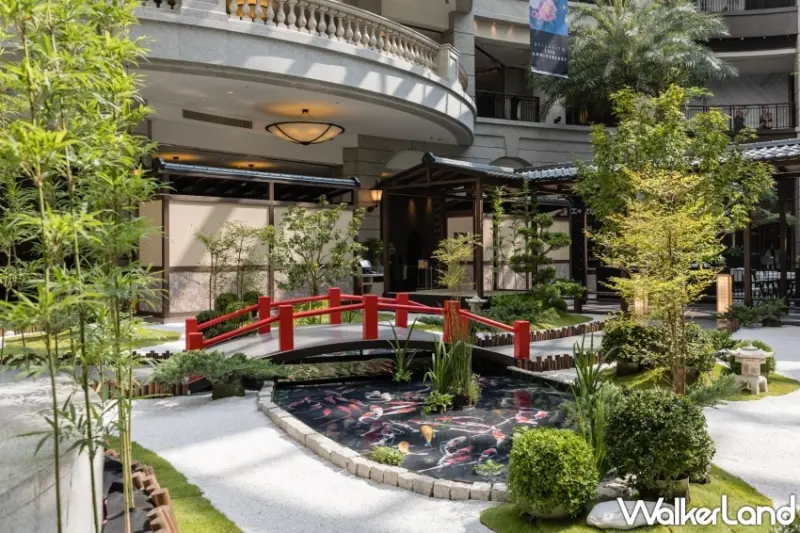 同時,傳統的木製穿廊與屋簷,靈感源自於日本民族對於木造建築的迷戀,以及對於自然萬物的景仰。穿廊兩端設置榻榻米,為每一位來到這的國人提供最佳休憩空間。置身其中,沐浴在日式禪學的沉靜,深切感受清幽之美。造景中央的池塘裡,錦鯉瀟灑悠游,色彩絢爛猶如水中牡丹,尊貴不凡,寓意吉祥長壽,也象徵向上天的祈福,相傳能為到此一遊增添好運。