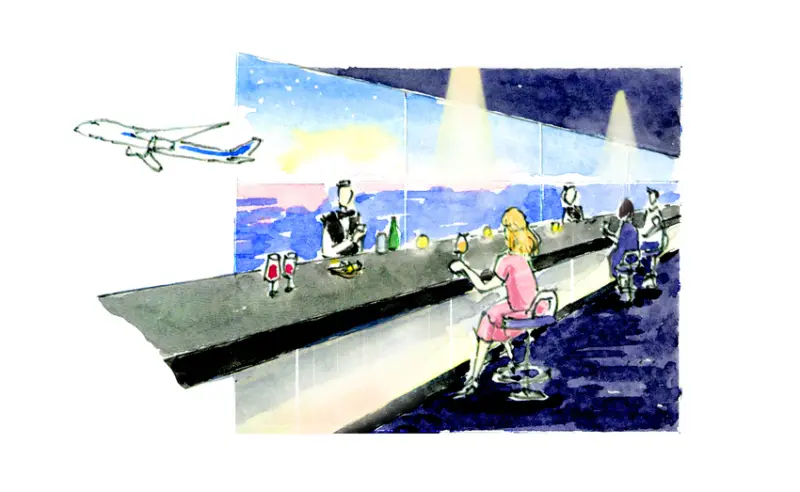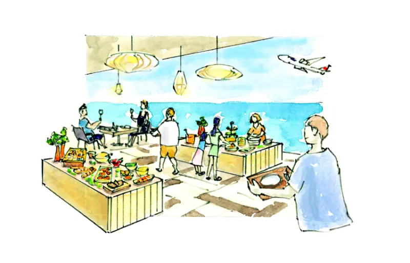 餐廳為以天空和雲朵為主題設計的開放性空間。為了能使用餐動線更有效率,採用了自由用餐風格的「快速全自助餐(express full buffet)」,也提供外帶服務。這項新的用餐體驗除了可以維持自助餐品質,也提供了高度便利性。餐廳除了有可以享受食物在眼前烹調樂趣的現場表演廚房外,還可以欣賞大阪灣的景致,讓旅客可以充分享受愉悅的用餐時光。![]()