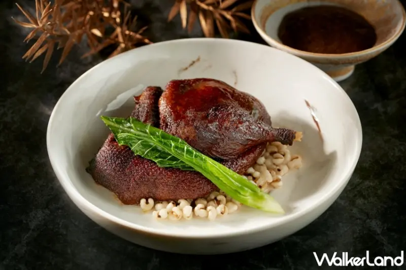 而說到粵菜,就不能忘了「薏仁先知鴨」,特別挑選養育28天、肉質細嫩的宜蘭櫻桃鴨,以醬油醃製後油炸至表面上色,再以薑、蔥、八角等燜煮,底部墊上蒸薏仁增添口感層次,最後淋上黑松露鴨肝醬汁,品嚐入口即化的柔嫩鴨肉。