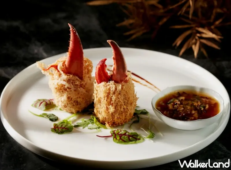 還有讓人吃一口就停不下來的「荔茸釀蟹鉗」,主廚精選在地大甲芋頭,蒸熟後立即放置於砧板上,以菜刀輕壓出芋泥餡,即為芋茸,並細心地將芋頭塊挑除,以呈現細緻滑順的口感,鬆綿芋泥與肥厚蟹肉交織出絕佳風味。