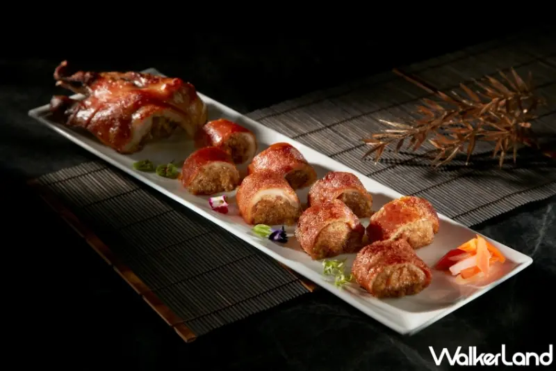 本次「巡味.年華」懷舊粵菜,首推就是循古老手法的傳統老菜「手創乳豬糯米卷」,主廚將乳豬去骨、肉與油脂,將豬皮剃到最薄的一層,填入含有肝臘腸、香菇及香菜的糯米飯,以不同火力烤熟上色後切塊,重現正宗粵菜。![]()