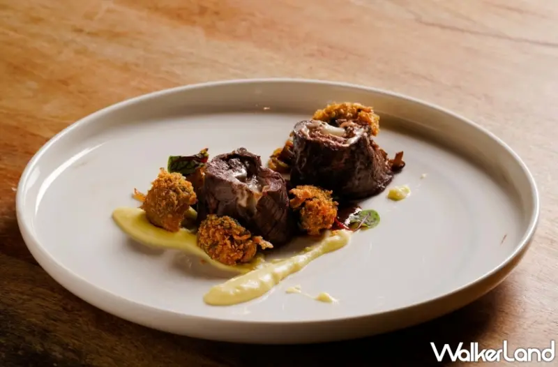中西合璧的烹調手法一直是時下趨勢,在此次的菜單裡,徐晨翔(Sean)的台灣烏魚子鮮蝦酪梨沙拉即是以台灣在地食材融入西方菜式,林承翰(John)的酥炸米線蝦搭哈里薩醬則改良中式米線蝦,連家輝(Jeff)的香煎和牛結合鹹蛋與西餐常見的洋芋泥,襯托肉質的軟嫩。