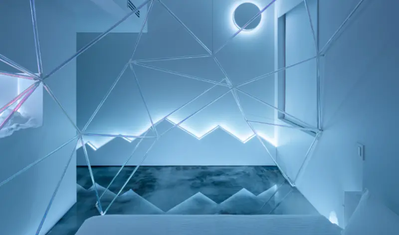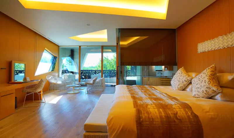 客房設計也同建築外觀,房內可見許多不規則的幾何圖形,內部裝潢大量選用木頭等帶有溫度的自然建材,並著重採光設計,讓自然光能透過幾何圖形的窗戶照射進來。此外,因飯店座落於山林間,旅人可從房內遠眺山岳美景。![]()