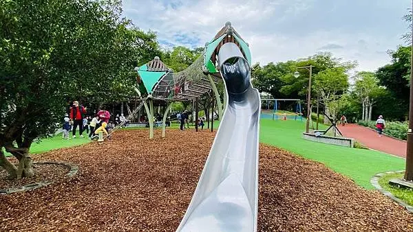 腹地極大,一整片綠油油超舒壓的,新增共融遊樂場,有彈跳床、鳥巢鞦韆、單點鞦韆、雙道溜索、溜滑梯等遊樂設施。除此之外還有生態池、天空廊道視野極好可遠眺台北巿區美景。<全文介紹>