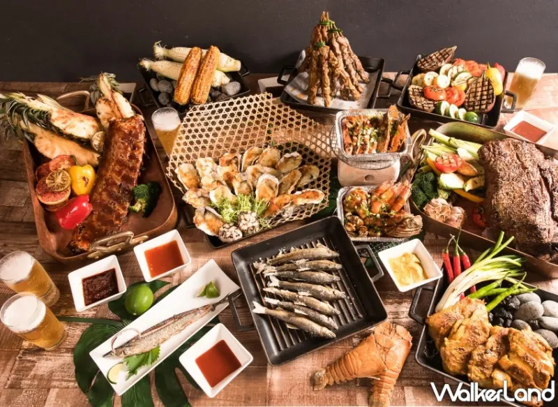 同時,現切肉品區則是提供鮮嫩多汁的美國燒烤牛排、甜辣交融的紐澳良風味燒烤豬肉,假日則提供美式燒烤豬肋排,也讓肉肉控大飽口福。另一重頭戲為露營必吃的烤肉,主廚準備了照燒雞肉、13香雞肉、沙嗲牛肉、孜然羊肉、田都里烤雞肉、馬告胡椒豬肉等肉串,除可品嚐每款肉品燒烤後的天然原味,還可再搭配各國口味的醬料,一次就能品嚐到多達百種風味的烤肉串。同時,再來杯新台式代表「柏克金啤酒」,為城市燒烤饗宴畫下完美的句點。