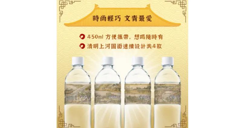「清明上河圖」係中國十大傳世名畫之一,流傳至今歷久不衰,亦成為眾所皆知的畫卷。[多喝水]與國立故宮博物院本次推出的聯名商品共有4款,每款為清明上河圖部分圖像,結合4款可完整呈現〈清院本清明上河圖〉的樣貌,也展現了[多喝水]特殊扁瓶包裝獨特魅力,喜愛古文物的你,快來尋找收集,拼出完整清明上河圖,讓喝水多份樂趣。![]()