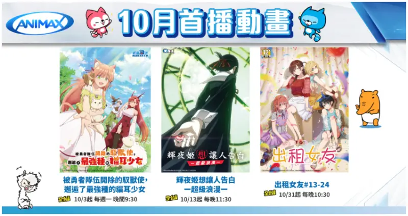 Animax頻道10月強檔動畫輪番上陣!首先登場的就是與日本同日放送的新番急送《被勇者隊伍開除的馭獸使,邂逅了最強種的貓耳少女》,快跟著我們一起踏上冒險的隊伍吧!除此之外還有人氣戀愛動畫《輝夜姬想讓人告白~天才們的戀愛頭腦戰~》和《出租女友》即將帶來全新一季的內容,經典搞笑的《銀魂》、可愛療癒的《為了女兒,我說不定連魔王都能幹掉。》與偵探調查的《魯邦三世Part 5》等多部精彩動畫等你來追!![]()