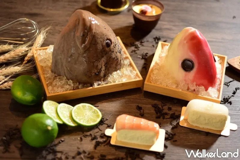 最後,當然是超人氣擬真壽司蛋糕「魚頭君」,以香草蛋糕鋪底,內餡則是以草莓番茄果凍、草莓慕斯及香草蛋糕交錯堆疊,並以濃厚白乳酪慕斯灌模包覆,塑造出魚頭外型,再利用混合藍莓果泥的果膠和食用亮粉裝飾外層,打造鮮魚光亮表皮的仿真感,嵌入黑白巧克力製成的雙瞳,置於日式木盤中,最後鋪上薄荷檸檬口味的果凍冰塊即完成。
