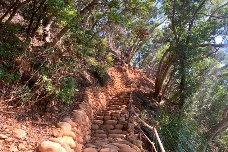 劍潭古道全長雖然只有2.5公里,但一開始就有連續五段的長爬坡,走起來也算是挑戰十足,步道全部走完大約60分鐘。<全文介紹>