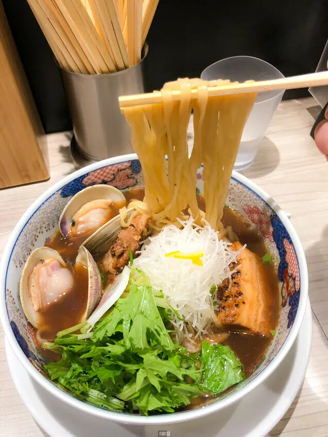 湯頭偏濃稠,多了花生醬與胡麻醬的香氣及濃郁感,伴隨山椒及柚子在舌尖稍縱即逝的麻,很解膩,喝到最後還有洋蔥給予的嗆辣感,熱的時候喝感覺都很不錯,但隨時間推移,湯頭溫度降低,顯現出缺點,會有越喝越膩的感覺。<全文介紹>